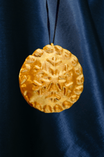 A mince pie bauble made in gold PLA (a bio plastic) with a light glitter finish.