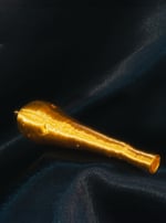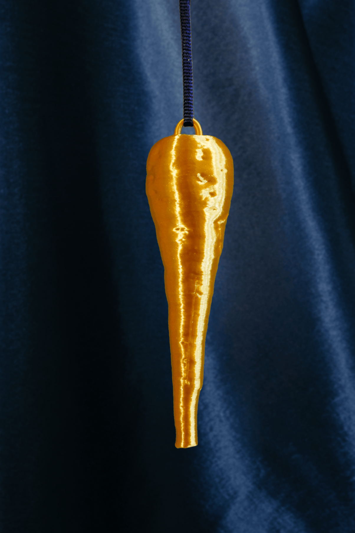 A parsnip bauble made in gold PLA (a bio plastic) with a light glitter finish.