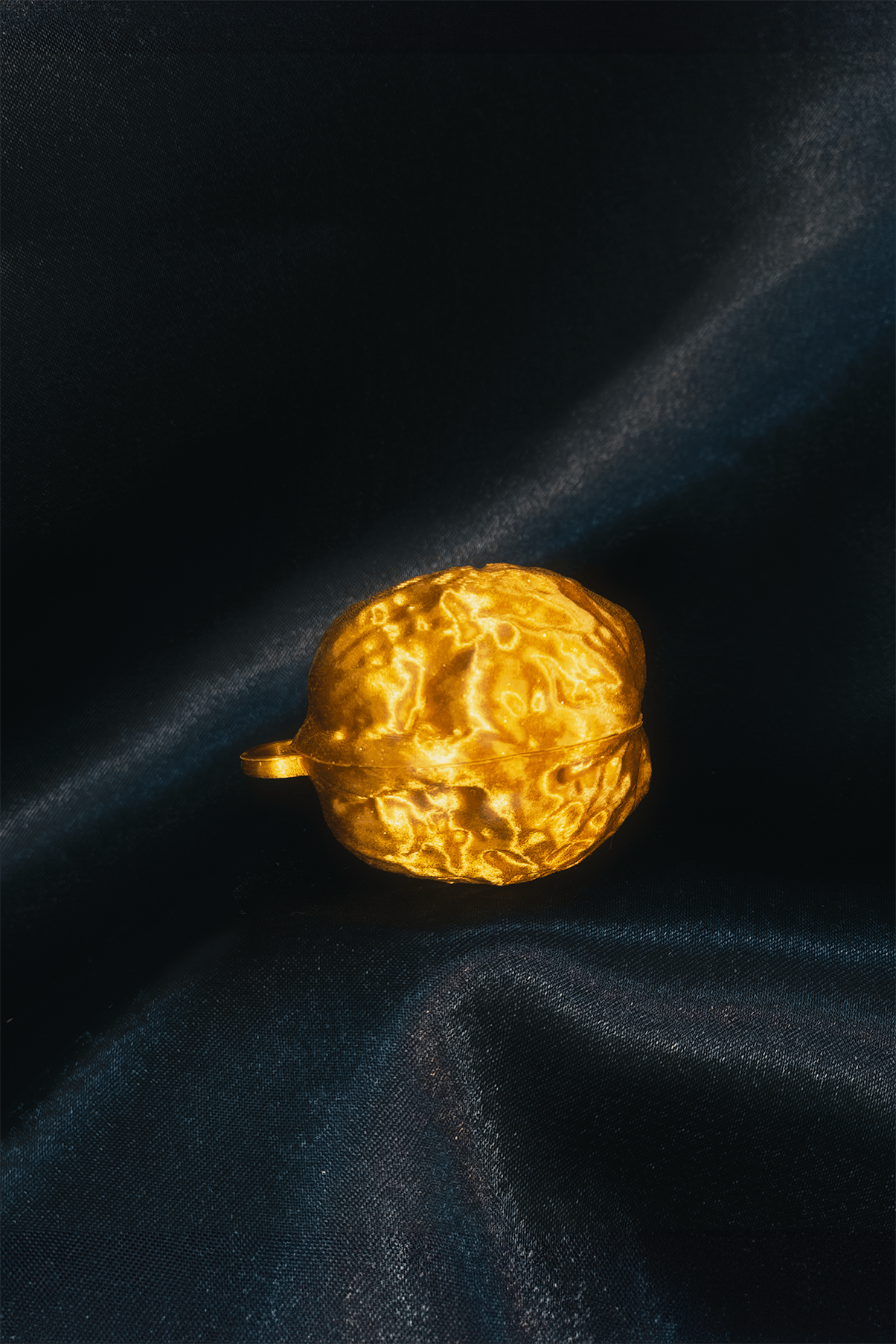 A walnut bauble made in gold PLA (a bio plastic) with a light glitter finish.